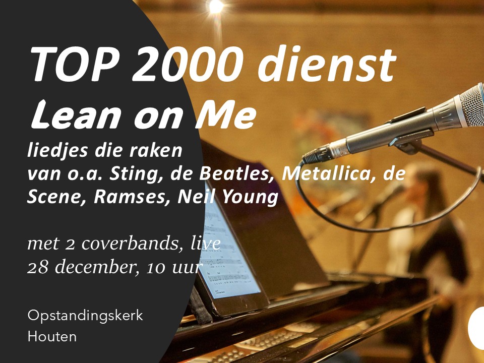 Twee coverbands (de Amazing Grays en een band speciaal voor deze gelegenheid samengesteld) spelen allerlei popliedjes, bijv. van de Beatles, Sting, Metallica, the Scene. Het zijn liedjes die raken, omdat ze onze vragen, verlangen of gemis vertolken, en vertellen van liefde en vertrouwen. Er zijn persoonlijke verhalen bij liedjes. Ds. Rebecca Onderstal legt verbindingen met de Bijbel, bidt met ons en spreekt over het thema ‘Lean on Me’. Welkom!