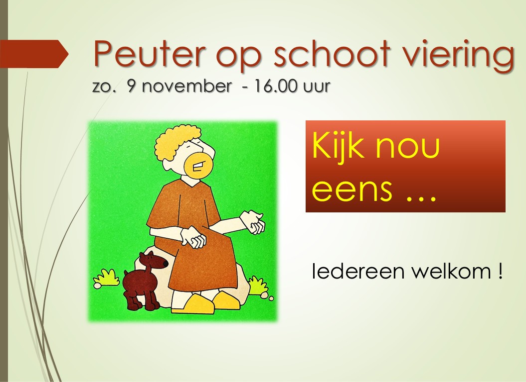 Het verhaal van de blinde Bartimeus staat centraal in de Peuter op schoot viering van dit seizoen: zondagmiddag 9 november om 16.00 uur, in de kerkzaal van de Opstandingskerk. Speciaal voor peuters van 2 en 3 jaar.