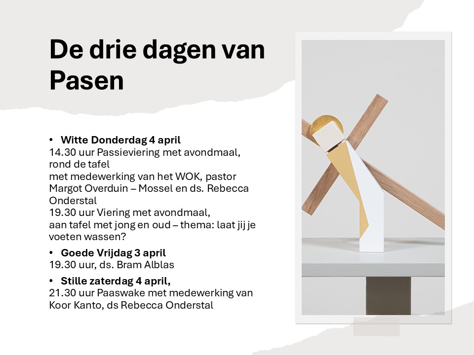 - Om 14.30 uur is er een Passieviering met avondmaal voor senioren en wie verder wil aansluiten. Er wordt aan tafel gevierd, en het WOK zingt. Voorgangers: pastor Margot Overduin – Mossel en ds. Rebecca Onderstal